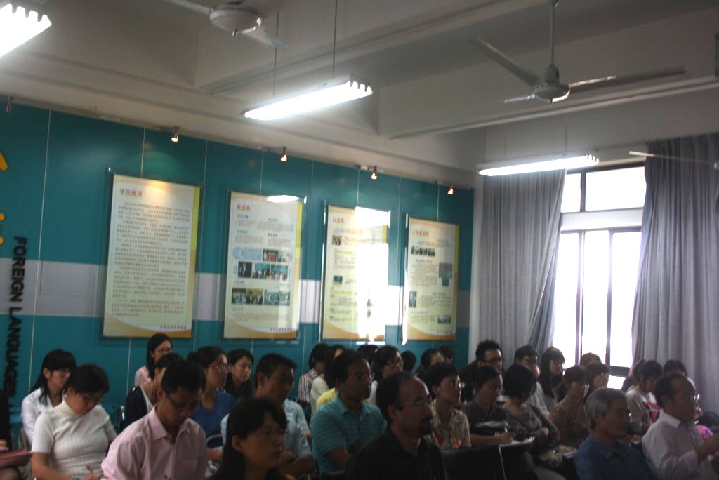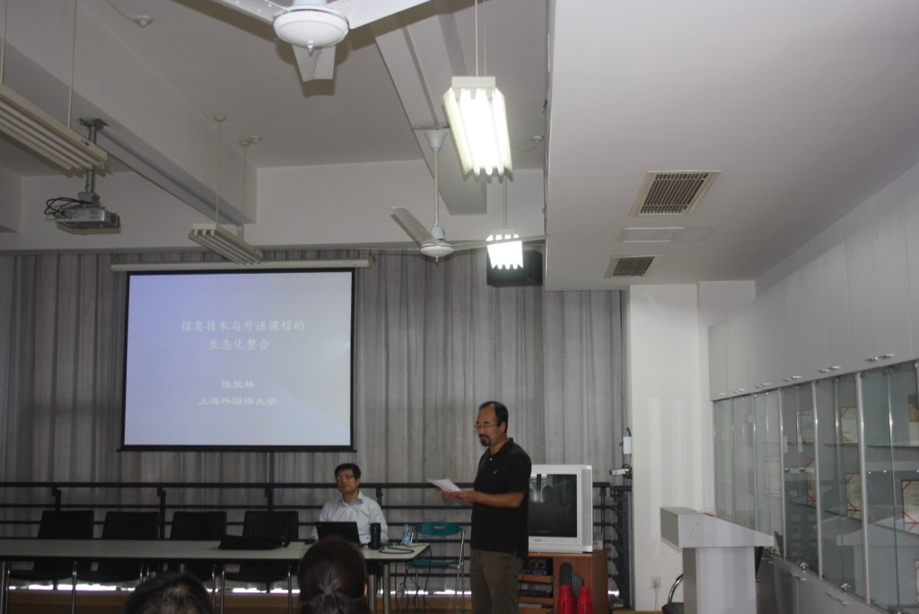 讲座在轻松愉快的氛围中进行,陈坚林教授以新一轮大学英语课程改革为背景导入,重点分析了当前语言教学研究的新动向,提出了综合教学、语言的地道性与真实性、语言教学与学习的自主性等六个理念,并鼓励老师们在教学研究领域自主创新;接着,他和大家探讨了计算机辅助教学(CALL)的现状及面临的新挑战。最后,陈教授着重讲述了计算机和外语课程的生态化整合,提出了创设生动的数字化的学习环境的必要性与迫切性,并对外语教学和课程设置的系统综合发展提出设想。与此同时,陈教授与师生进行互动交流,耐心解答了师生们提出的问题,现场学术气氛十分浓厚。