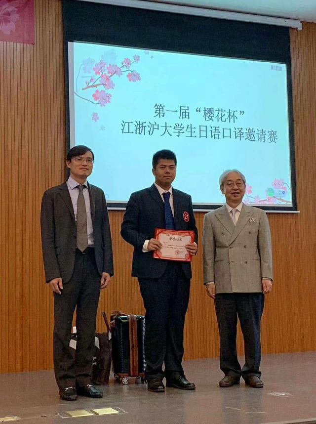 6月8日,第一届“樱花杯”江浙沪大学生日语口译邀请赛在杭州师范大学仓前校区隆重举行,来自上海外国语大学、复旦大学、同济大学、浙江大学等江浙沪23所高校的日语专业本科生、研究生选手参加了比赛。东京学艺大学名誉教授松冈荣志、浙江省人民政府外事办公室王敏老师、上海中日校企联盟会叶维英会长、上海外国语大学徐旻副教授和杭州师范大学王忻教授担任本次邀请赛评委。beat365官网beat365官方网站日语翻译专业2018级研究生陈涛同学代表beat365官网参赛,经过激烈角逐,以出色的表现荣获本次邀请赛特等奖。