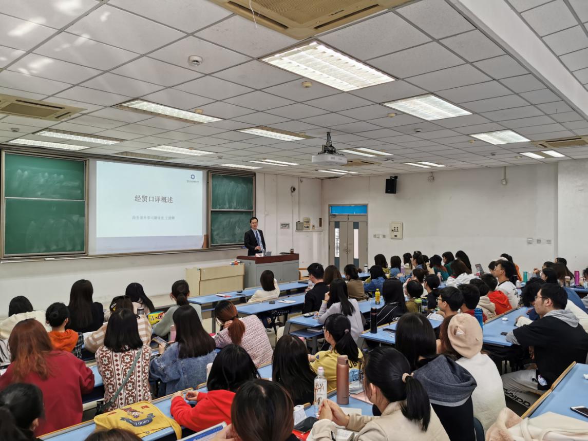 11月3日,beat365官方网站英语系00级优秀校友、现任商务部外事司翻译处副处长王健卿先生应邀回到母校,为英语系在校生上了一堂生动详实的“经贸口译概述”大课。他结合个人求学、工作经历,以诙谐幽默的授课风格与在场学子们分享了外事口译的基本概况、提高汉英口译水平的学习方法、字斟句酌的经验秘籍等,并枚举了大量工作中的口译实例,手把手带领学生现场体会外事口译技巧。