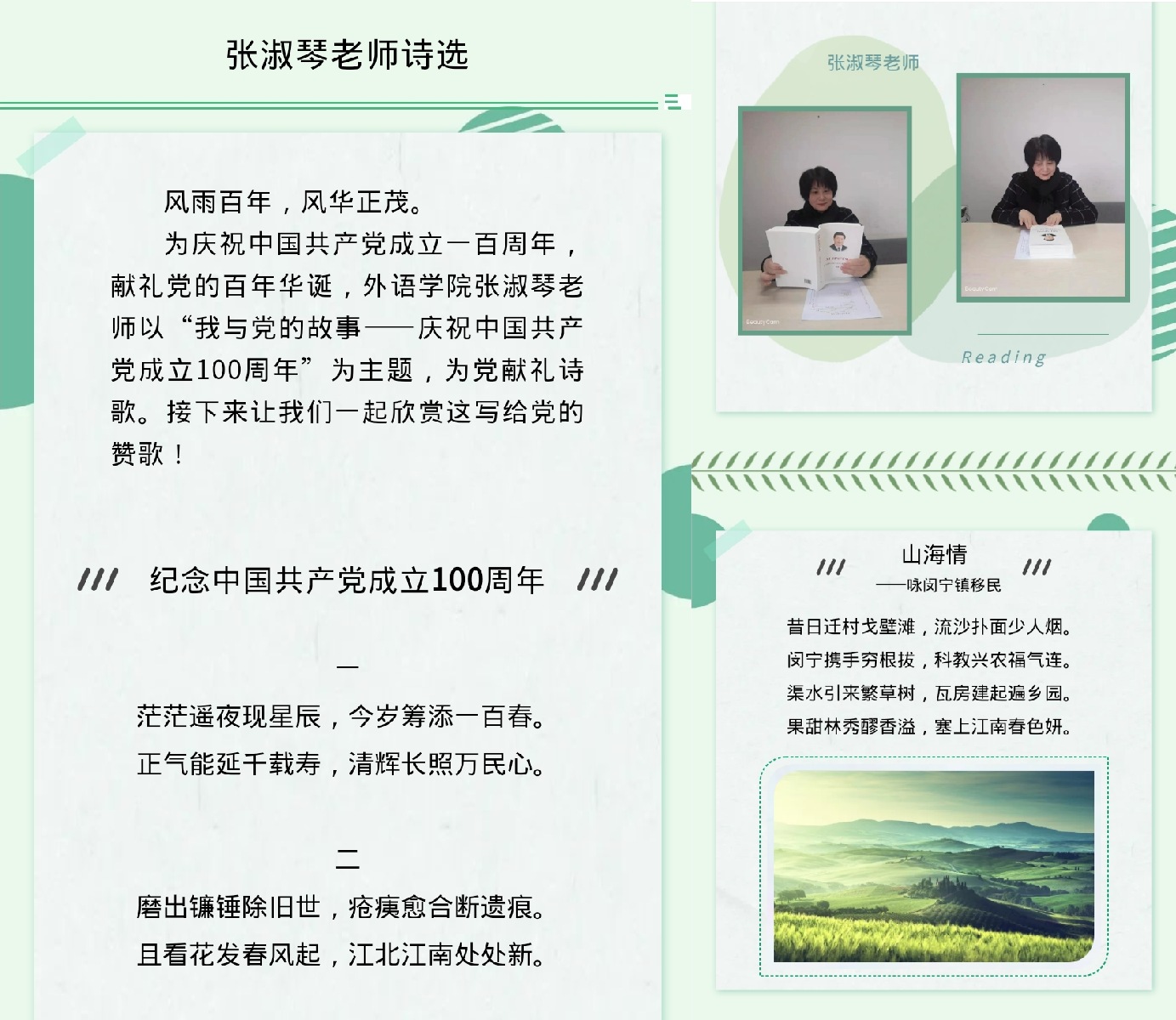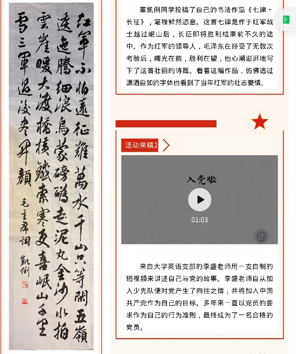 “激昂发声,唱响党史学习主旋律”。beat365官方网站党委坚持紧扣“为什么学习党史”“学什么党史”“怎样学习党史”三大问题,还充分利用新媒体,打造极具专业特色的虚实结合党史学习平台,面向全院师生开展红色征集令——我与党的故事,使党史文化理论更具有吸引力,促进党史文化真正实现“入脑、入心”,坚持做好学院师生党史学习教育的“传声筒”;依托“东华外院新闻站”公共号开辟党史学习微专栏,易班平台开展“党史故事我来讲”等丰富多彩的活动平台,坚持党史学习教育的引领地位,以此发挥出党史学习教育的强大育人功能;通过利用互联网创设教学情境,打造“互动式+体验式”党史学习新课堂,将党史融入学院全员、全程、全课程育人的大格局,打通党史教育“最后一公里”,将党史的滋养转化为全院师生的政治本色,奋斗的行动动力。