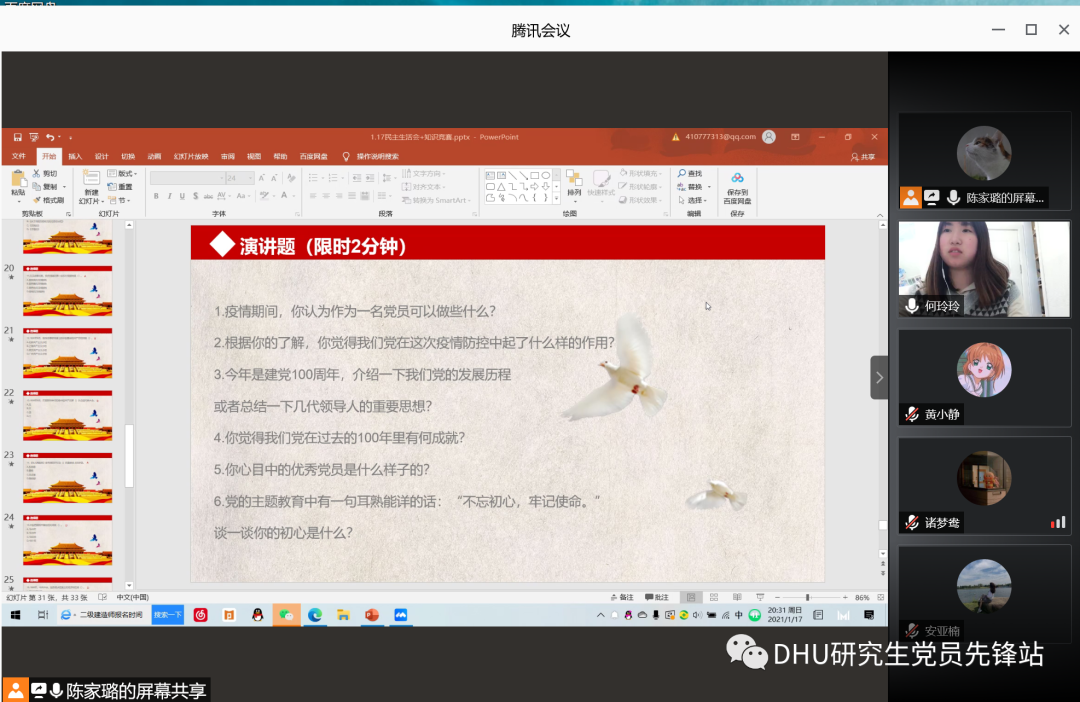 为深入学习四史知识,于学思践悟中坚定理想信念、于奋发有为中践行初心使命,营造“知史爱党、知史爱国”的良好氛围,beat365官方网站20硕团支部于1月17日举办学习“强”国,抗“疫”到底四史知识线上知识竞赛。支部成员积极响应,精心准备,呈现了一场精彩的四史知识竞赛。