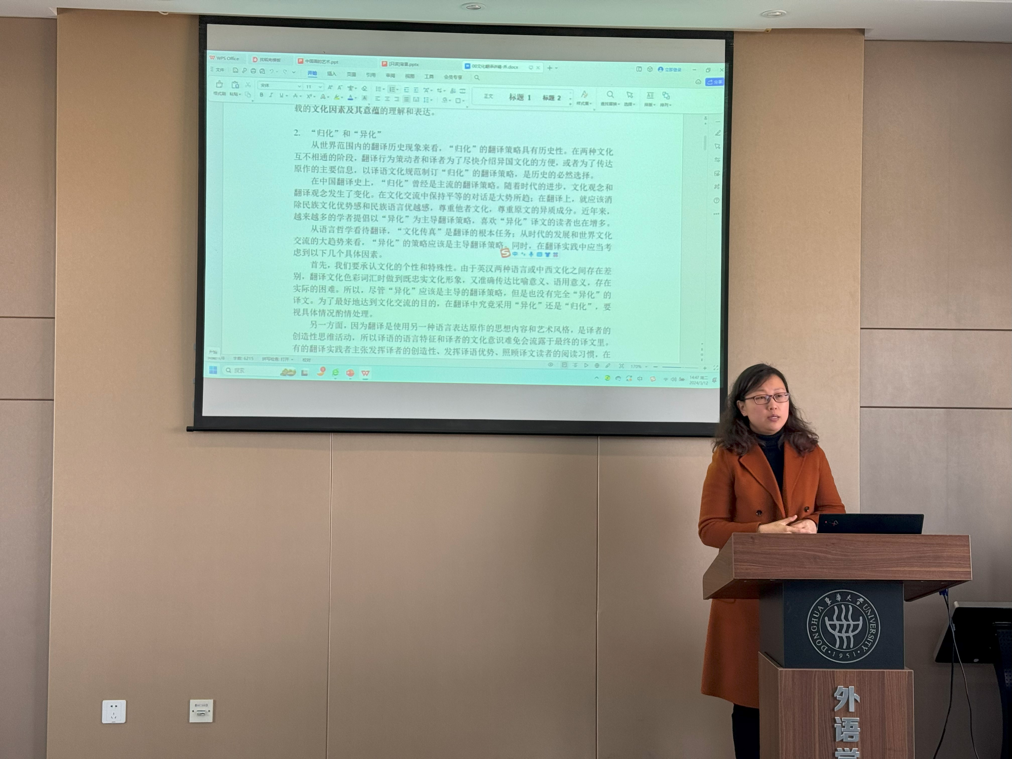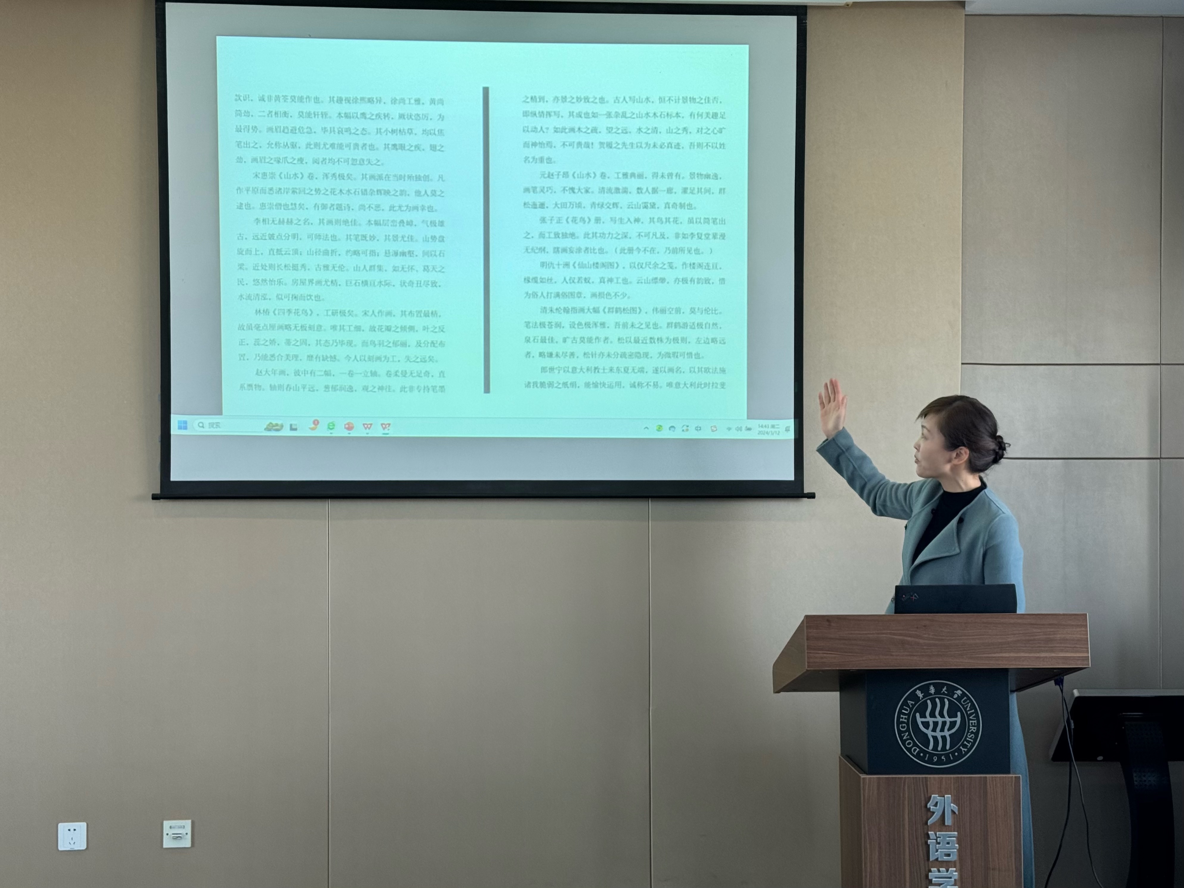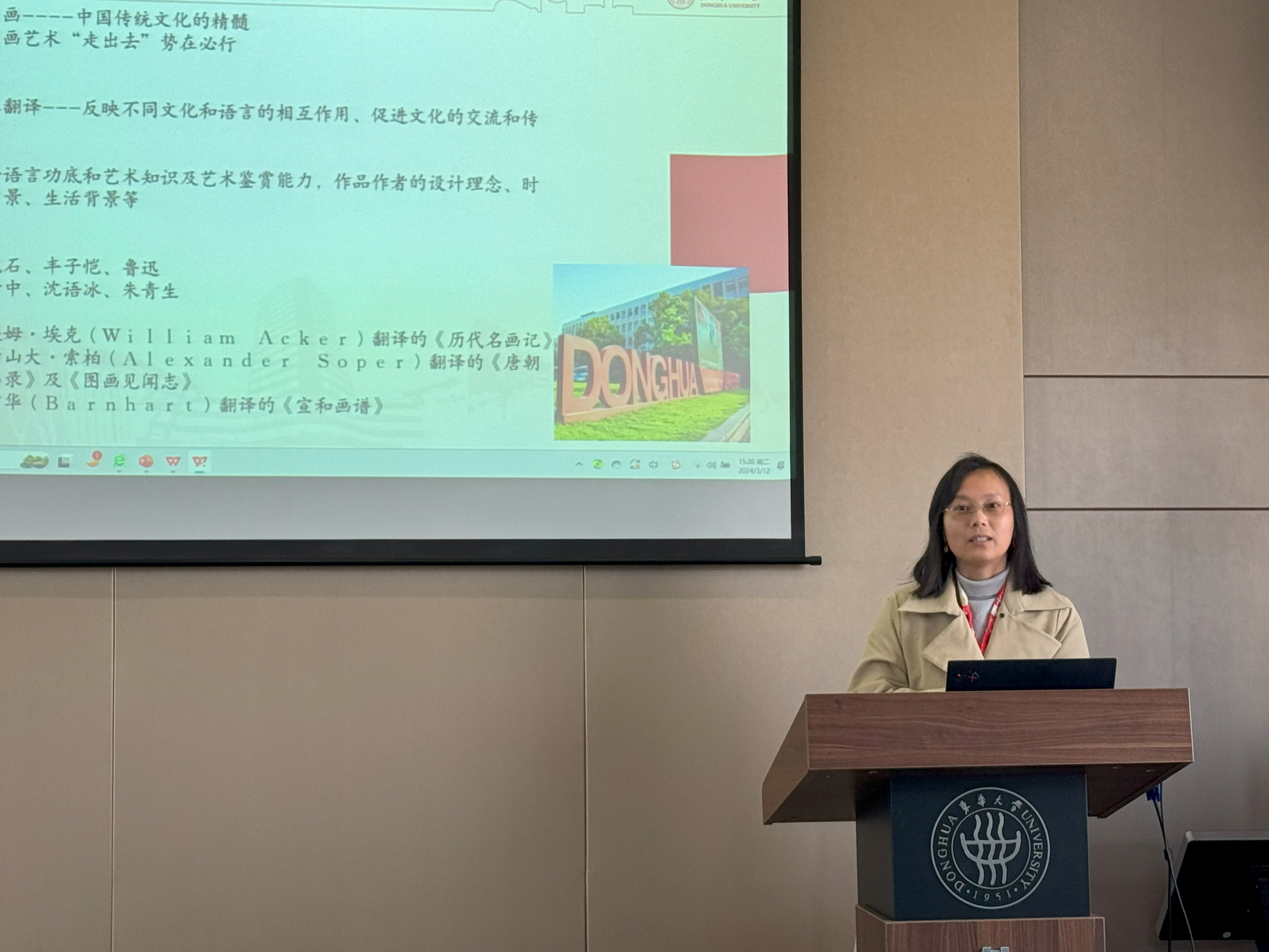 张曦首先对翻译项目做了介绍,《中国画的艺术》一书蕴含着丰富的中国历史文化,其英译对中国文化的国际传播具有积极意义。英语系副主任乔雪瑛、翻硕导师杨捷、张曦先后围绕文化翻译、艺术翻译、译后编辑等方面给学生分享了宝贵的翻译经验。