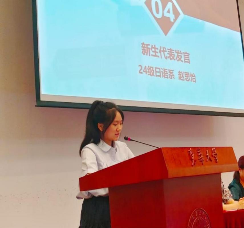 24级日语系新生代表赵思怡表达了她对上海这座城市的向往、对东华外院的期待以及对未来发展的期许。作为新一届东华人、外院人,她表示必将树立远大理想、扎实学业基础、提升内涵修养,以小我之力为东华注入新鲜动能,讲好自己的人生故事、讲好我们的中国故事。