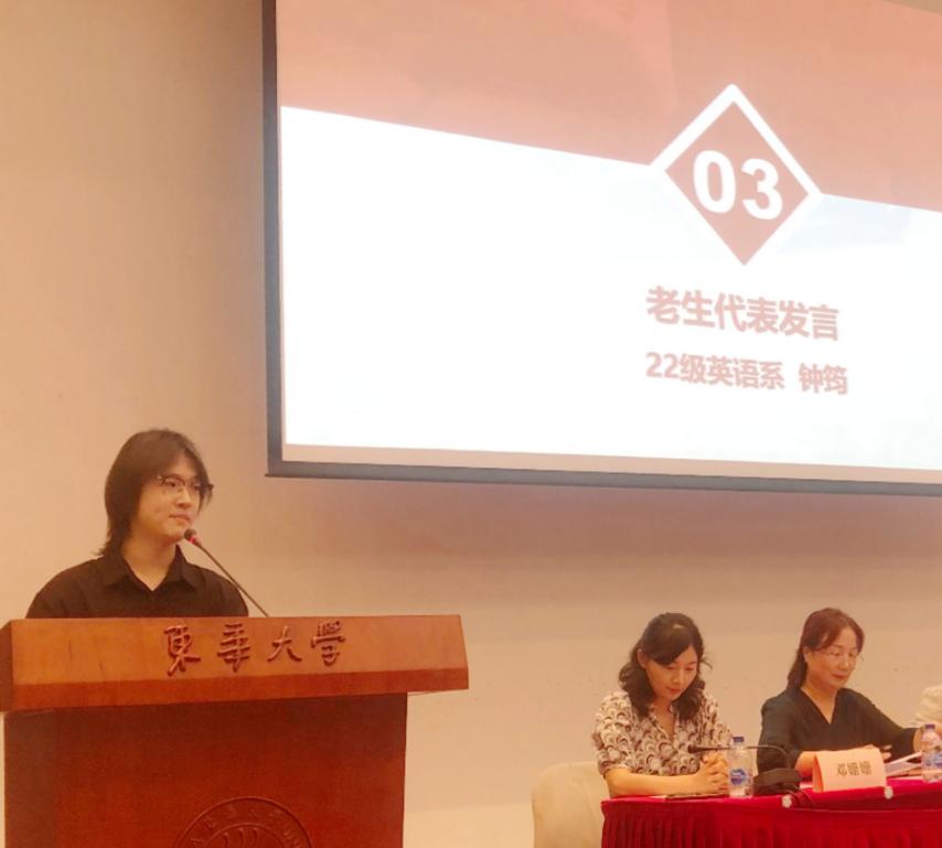 22级英语系本科生、学院团委副书记钟筠代表在校生向24级新生分享了他在大学的所思所得,他建议学弟学妹们在轻启梦想中设计未来、在拓宽眼界中奋斗人生、在胸怀“国之大者”中创造未来,站在更高的起点上拥抱世界,为促进中外对话、交流和互鉴贡献外语人的一份绵薄之力。
