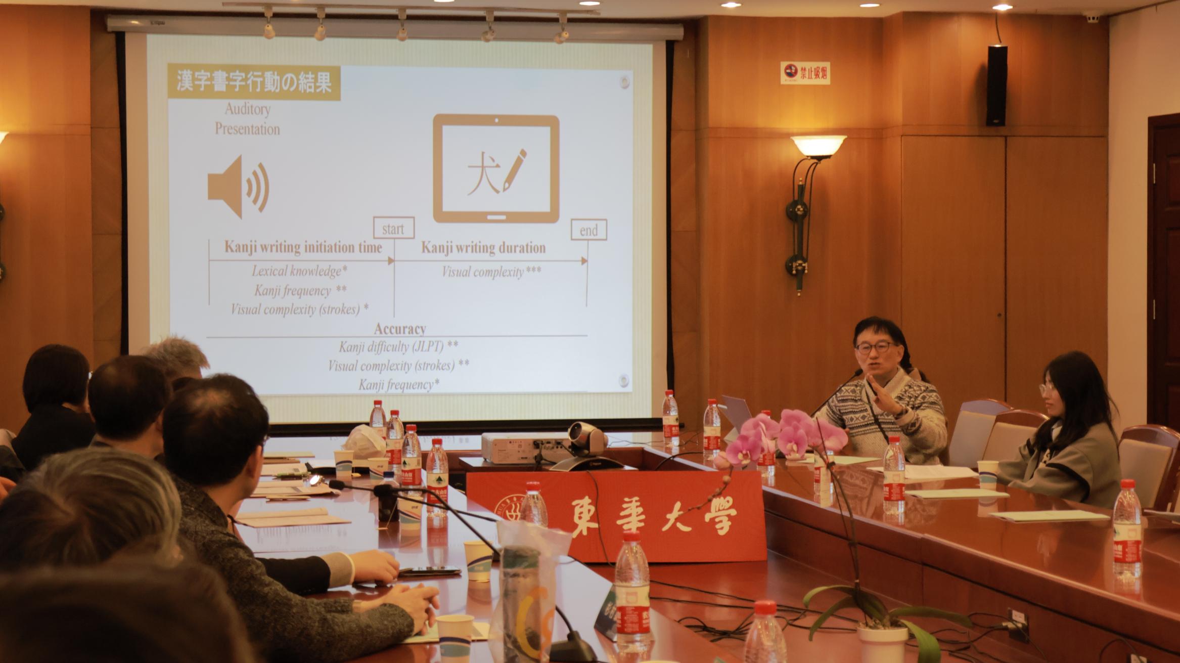 研讨会分为“语言与翻译”和“文学与文化”两个分会场。在“语言与翻译”分科会上,来自名古屋大学的玉冈贺津雄教授、杉村泰教授、丸尾诚教授和胜川裕子副教授分别围绕“越南日语学习者的汉字书写机制”“日语复合动词「V1-通す」与「V1-抜く」的语义差异”“中文动补短语‘V够’语义生成机制”和“汉语介词‘离’的空间与时间间隔”等问题进行了探讨。beat365官方网站陈月娥教授从思想史的视角对“西村茂树的文字观”进行了分析。上海外国语大学毛文伟教授、王晓华副教授和须军博士分别就“基于熟练程度的中国日语学习者副词使用情况”“作为意志表达的日语「ツモリダ」的时体系统”和“接续助词「ものを」的语法化”等问题进行了研究分享。